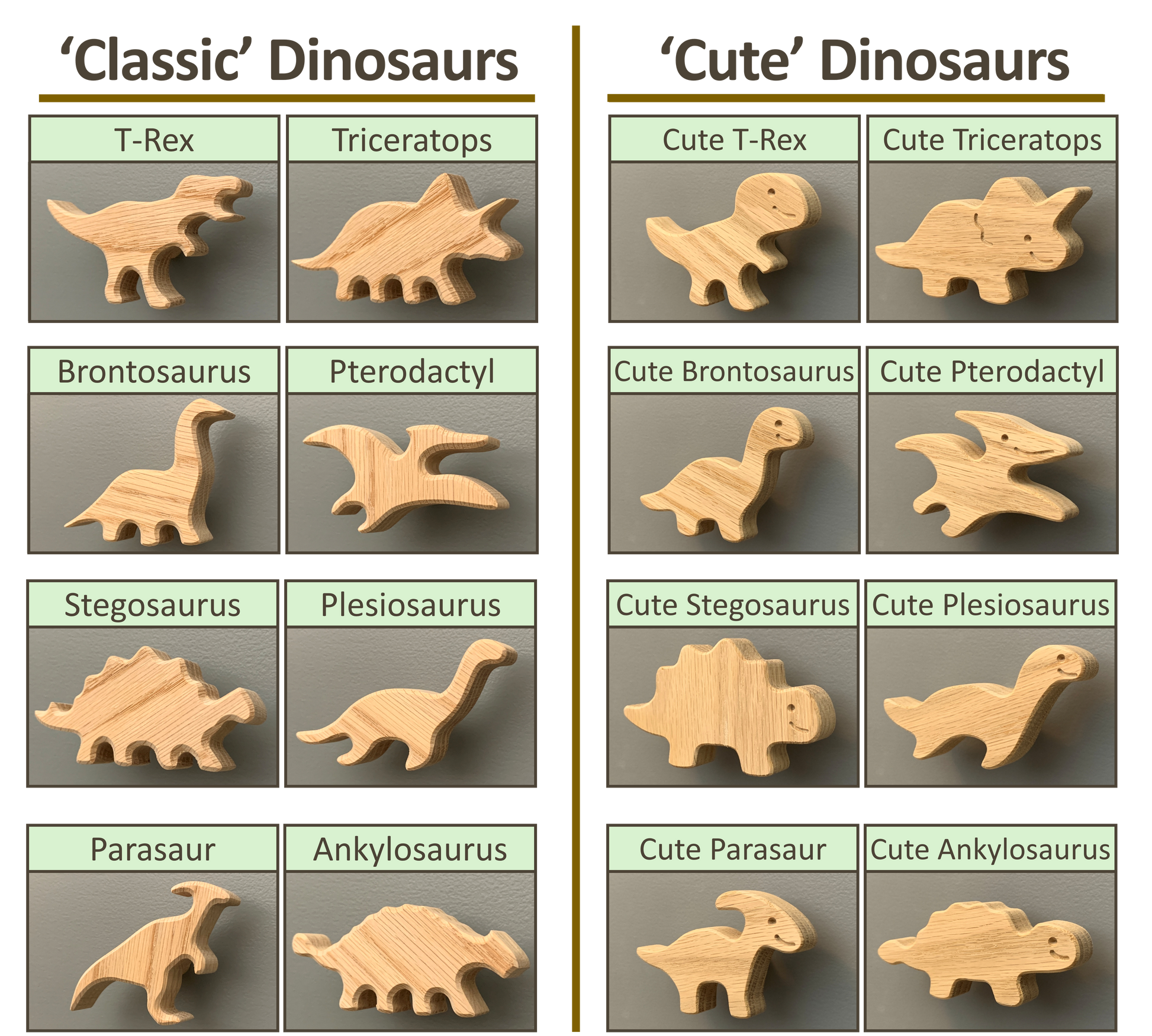 Handcrafted solid oak animals that complete your nursery.